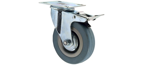 Литая термопластичная серая резина отличается высокой износостойкостью и подходит для передвижения по любым напольным покрытиям. Полипропиленовый обод с двух сторон закрыт стальными кожухами. В оси находится подшипник скольжения. Прессованный стальной кронштейн оцинкован и оснащен шарикоподшипником в поворотном узле. Тип крепления – платформенный.