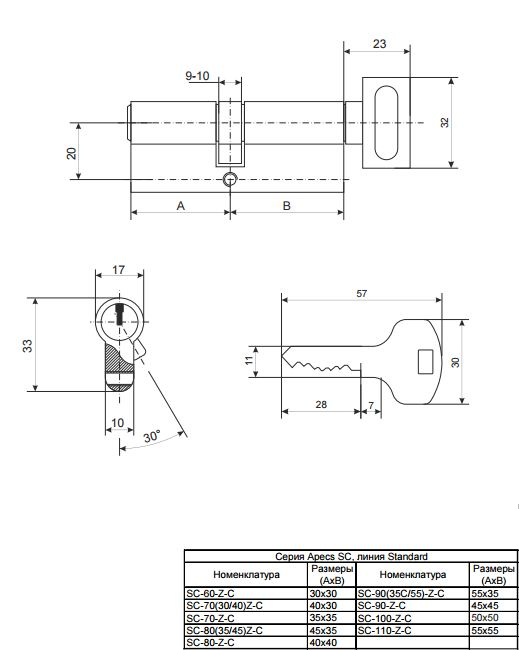 Цилиндры серии SC с английским ключом. Сертифицированы на 2-й класс по ГОСТ Р 5089-2011. Два опорных пина с проточкой для защиты от вскрытия отмычками. Запатентованная защита от бампинга. Два закаленных штифта в сердечнике и штифт в торце корпуса для защиты от высверливания. Теоретическая секретность: 46 656 Линия продукции: Standard.