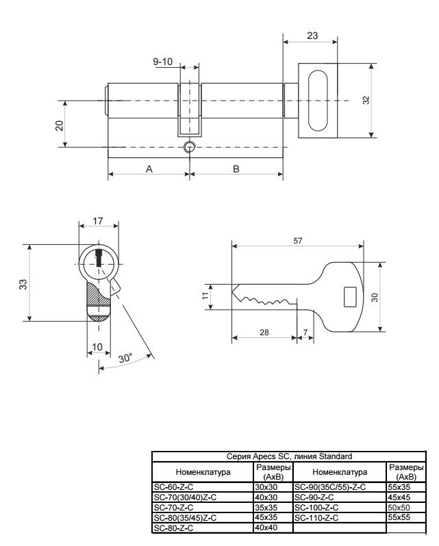 Цилиндры серии SC с английским ключом. Сертифицированы на 2-й класс по ГОСТ Р 5089-2011. Два опорных пина с проточкой для защиты от вскрытия отмычками. Запатентованная защита от бампинга. Два закаленных штифта в сердечнике и штифт в торце корпуса для защиты от высверливания. Теоретическая секретность: 46 656 Линия продукции: Standard