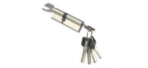 Латунный цилиндровый механизм с 5 перфорированными ключами. Ключи из латуни. Крепежный винт в цвет цилиндра. В закрытом состоянии поводок отклонен на 30 градусов, что обеспечивает дополнительную защиту от выбивания. 7 пинов, цилиндр ключ-вертушка, размер 80мм (30в*50).
