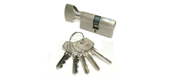 Латунный цилиндровый механизм с 5 английскими ключами. Ключи из латуни. В закрытом состоянии поводок отклонен на 30 градусов, что обеспечивает дополнительную защиту от выбивания. 5 пинов, цилиндр ключ-вертушка, размер 60 мм (30*30)