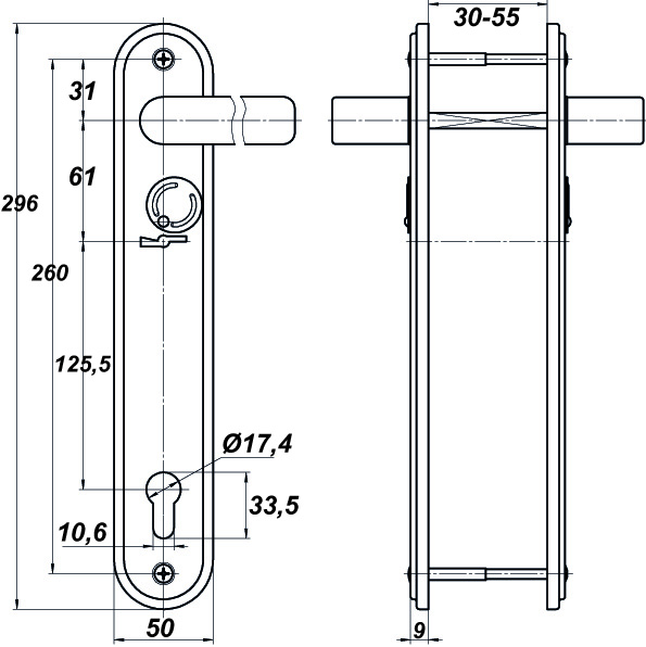 Ручка на планке для комбинированного замка с защёлкой и задвижкой ЗВ13 174.1.1. Изготовлена из алюминиевого сплава. Выпускается в левом и правом исполнении.