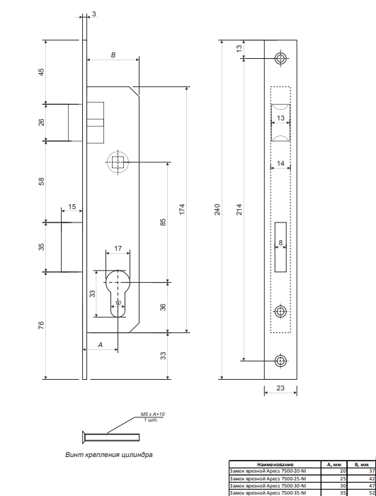 Замок врезной предназначен для запирания левых и правых дверей из алюминия и ПВХ профиля, открывающихся как внутрь, там и наружу. Корпус замка - оцинкованная сталь. Межосевое расстояние 85мм. Удаление ключевого отверстия 20мм. Размер лицевой планки 240*23мм. Размер ответной планки 190*23мм.