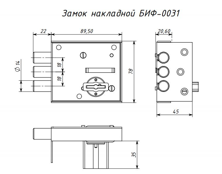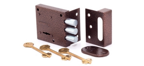 Замок накладной сувальдный. Засов изготовлен из трех стальных цилиндрических стержней диаметром 16мм. Выход засова 22мм. Замок открывается и закрывается ключом, снаружи и изнутри. Корпус покрыт защитной полимерной краской. В комплекте 3 ключа.