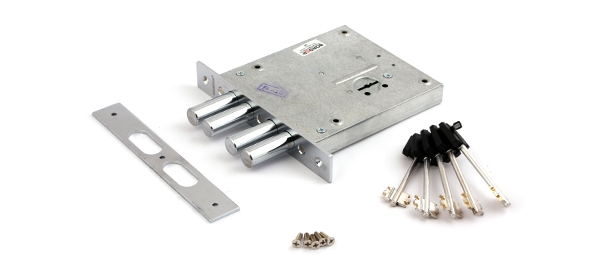 Врезной замок под круглые отверстия с цилиндрическим язычком, и четырьмя ригелями хорошей стойкости к излому. Снабженный надежным сувальным механизмом с двойной бородкой.
