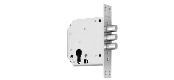 Замок врезной цилиндровый. Бексэт 80 мм. Три ригеля 16 мм в диаметре и вылетом 22,6 мм. Высота корпуса замка 98,6 мм, длина 110 мм. Торцевая планка: высота 165 мм, ширина 34 мм.