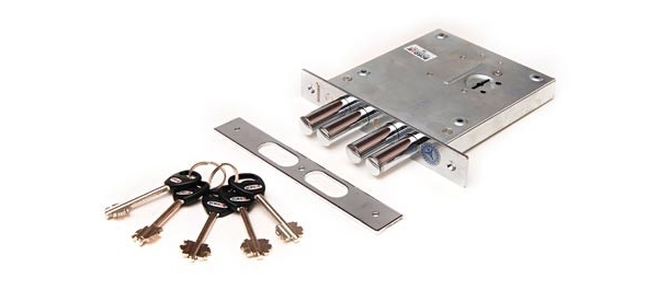 Врезной замок под круглые отверстия с цилиндрическим язычком, и четырьмя ригелями хорошей стойкости к излому. Снабженный надежным сувальным механизмом с двойной бородкой.