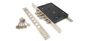 Замок врезной с фалевой защелкой и двумя дополнительными тягами, 8и-сувальдный блокирующий механизм сейфового типа. Замок сертифицирован 2 классом ГОСТ 5089-2011, сохраняет работоспособность после попадания в скважину посторонних предметов. Запирание двери в трёх направлениях обеспечивает повышенную сопротивляемость к взлому и высокую степень защиты. Выпускается правого и левого исполнения.Толщина корпуса замка 26мм. Основной засов, состоящий из 3-х пальцев, диаметром 17мм., имеет вылет 40мм., и приводится в действие с помощью ключа.Окончательное запирание поворотом ключа обеспечивает ригель,имеющий два пальца диаметром 17 мм с вылетом 20 мм. Дополнительные тяги имеют ход 20мм. и обеспечивают запирание двери вверху и внизу.Защелка обеспечивает фиксацию двери и приводится в действие ручкой.