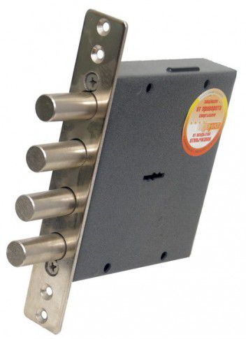 Открывается и закрывается с наружной и внутренней сторон двумя полными оборотами (на 4 фиксируемых положения) комплектного ключа. Засов изготовлен из 4-х стальных стержней круглого сечения, приваренных к пластине ригеля. Базовая комплектация предусматривает защиту от вскрытия замка отмычкой, защиту от высверливания стойки ригеля и защиту от вскрытия методом проворота. Не комплектуется запорными планками. Дополнительная комплектация предполагает: - установку каленой вращающейся шайбы на крышке замка, дополнительно предохраняющей от высверливания стойки ригеля. Класс замка - 4 Количество секретов 1 000 000 Выход засова - 40 мм. Диаметр стержня ригеля - 18 мм.